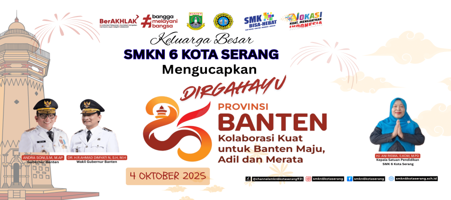 Serang, 4 Oktober 2025 — Dalam rangka memperingati Hari Ulang Tahun ke-25 Provinsi Banten, SMK Negeri 6 Kota Serang menyelenggarakan upacara bendera di halaman