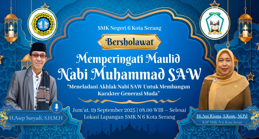 Kota Serang, 19 September 2025 – SMK Negeri 6 Kota Serang menyelenggarakan acara Bersholawat dalam rangka memperingati Maulid Nabi Muhammad SAW 1447 H di lapangan sekolah pada Jumat (19/9). Kegiatan ini mengusung tema “Meneladani Akhlak Nabi SAW Untuk Membangun Karakter Generasi Muda”.